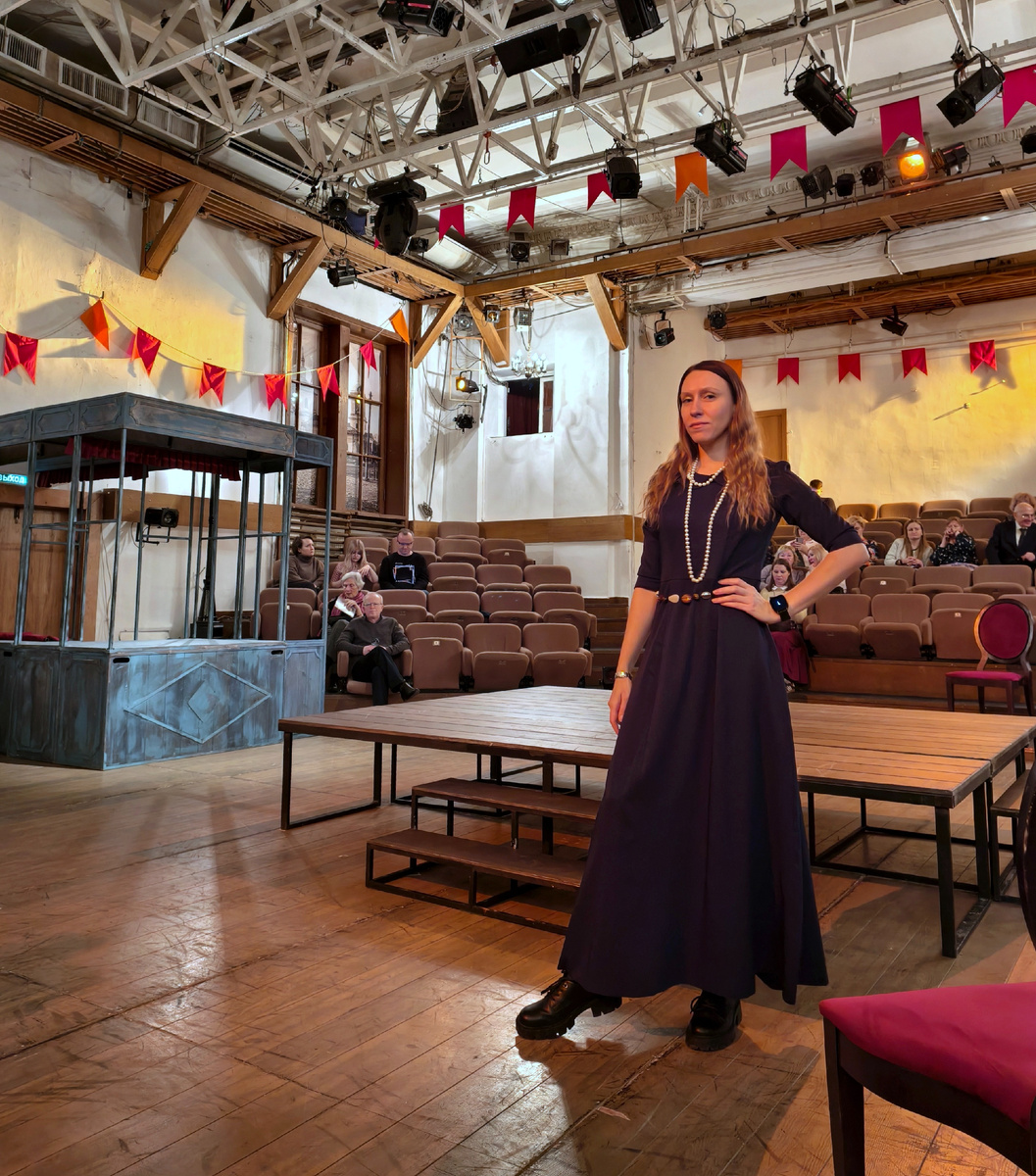 Зрительный зал в театре напоминает цирковой манеж: в центре расположена сцена, а вокруг амфитеатром поднимаются ряды кресел. Артисты обращаются во все стороны, поэтому взаимодействие за зрителями происходит в одной плоскости на расстоянии вытянутой руки.