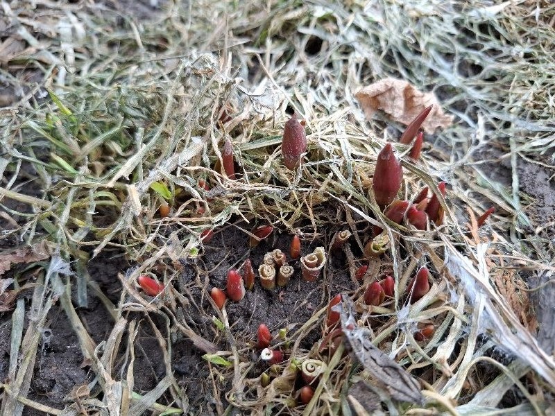 На фотографии, которую я, сдела 19 марта, видны молодые ростки тюльпанов, пробивающиеся сквозь прошлогоднюю траву и листья
