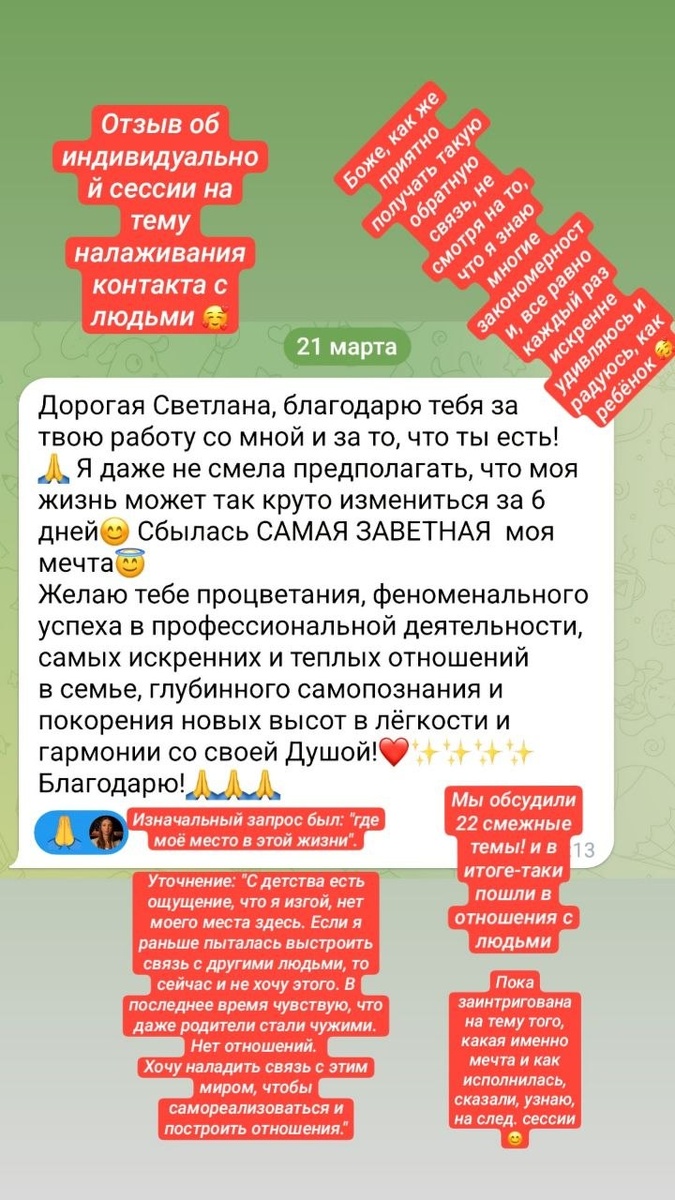 🥰 Боже, как же приятно получать такую обратную связь🥰, спасибо вам за нее, дорогие, этим вы вдохновляете меня продолжать даже, когда не просто и хочется всё бросить, и помогаете друг другу решиться идти в качественные изменения своей жизни, даже когда страшно и не верится, что это возможно. Изначально запрос был: "где моё место в этой жизни". Уточнение: "С детства есть ощущение, что я изгой, нет моего места здесь. Если я раньше пыталась выстроить связь с другими людьми, то сейчас и не хочу этого. В последнее время чувствую, что даже родители стали чужими. Нет отношений. Хочу наладить связь с этим миром, чтобы самореализоваться и построить отношения." На сессии рассмотрели 22 смежные темы: 1. нет контакта с людьми - одиночество, 2. депрессия, нет смысла жизни, 3. почувствовать жизнь, ощущение жизни, 4. отношения с мужчиной, 5. понять себя, миссию, предназначение, самореализация, 6. нет образования, не получается, 7. не уверена, что могу, 8. нет откликов на посты - значит не нужна