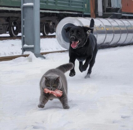 Вот к этому-то вагону и рванул Васька. Он там пару раз лазил. Даже как-то прогнал парочку крыс, хотевших прогрызть в днище дырки. Но потом ему показалось, что в вагоне что-то скрипит разговаривая. Поэтому испугавшись, кот не задержался там. Но тут… куда ж было деваться. В вагоне были высокие полки, куда пёс точно не сможет залезть. Васька прикинул, что там-то и можно будет спрятаться от собаки и, наконец, спокойно съесть добытое мясо. А мясом кот не делится ни с кем! Или он уже это говорил…
