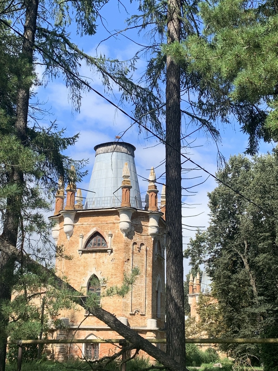А вот и само здание усадьбы напротив церкви - оно окружено высокими деревьями и сейчас огорожено забором. Однако и в таком виде оно напоминает необычный дворец, во многом благодаря двум высоким сказочным башням. К центральной части главного дома ведут две красивые лестницы, а крыльцо поддерживают колонны.
