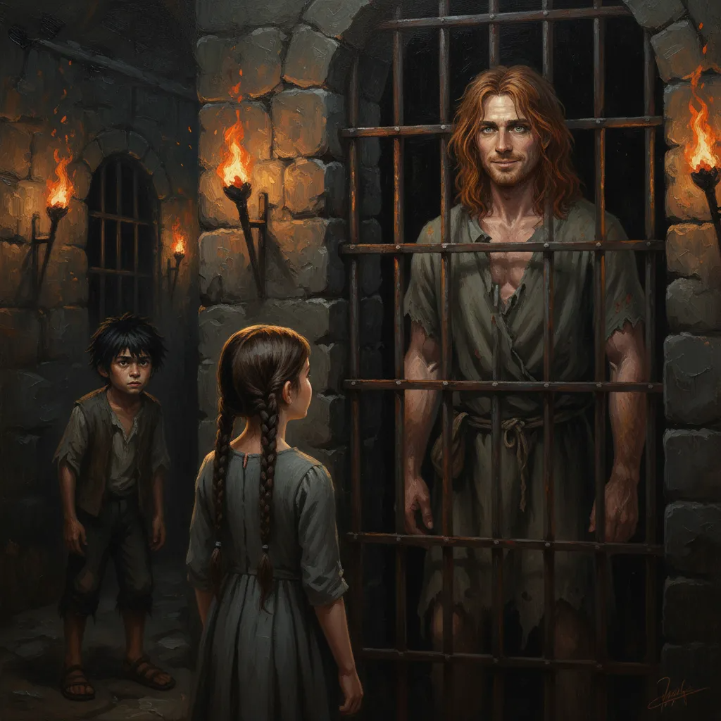 Кроме звука капающей воды и странных шорохов в стенах (крысы, догадалась девочка), слышались тяжёлые дыхания. Один из стражников сидел, прислонившись к стене, и мирно дремал. Бальт и Арья тихонько проскочили мимо него, ощутив крепкий запах эля. Тени их скрывали, но всё равно от ног шёл шум, как бы они ни старались идти тише. Наконец-то Бальт остановился и указал глазами на камеру. Тут же палы обви́ли решётку, и показалось лицо человека с разными глазами. Эти глаза впились в Арью, а губы тронула едва заметная улыбка.