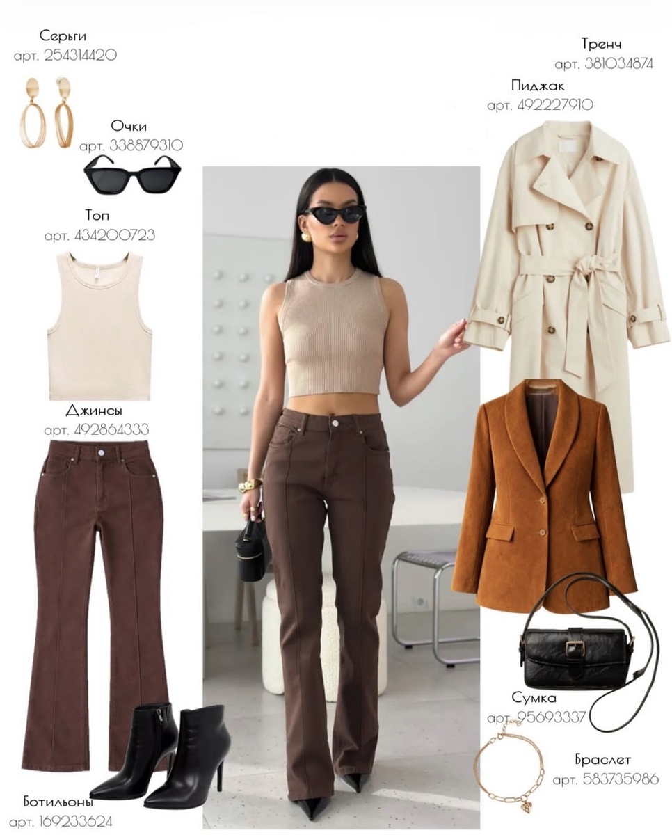Этот комплект — идеальный пример современной женственности. Здесь соединились тёплые оттенки кофе, молока и карамели, лаконичные силуэты и выразительные аксессуары. Образ получился чистым, элегантным и очень актуальным — таким, который уместен и в городе, и на встрече, и в повседневной жизни.
