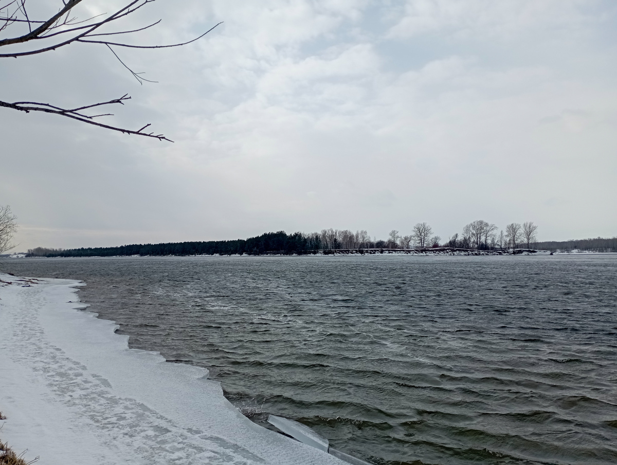 С утра валил снег, такой красивый, крупными хлопьями. Засыпал тротуары, навел чистоту на газонах. Пройтись бы по такому! Но после полудня весь снег как слизало. На улице тепло, +7 градусов. Может, съездить на Енисей, посмотреть, что там на берегу? Раз так меняется погода, конечно, должен быть ветер. В городе просто дует, раскачивает дорожные знаки, шумит в кронах деревьев. А на берегу, наверное, еще сильнее. Выхожу на ледяной припай. По обломкам видно, что он толстый, из чистого прозрачного льда, а сами обломки лежат на дне — глубина сантиметров 10. Можно смело подойти к самому краю. И точно дует так, что трудно камеру ровно держать. А под высоким берегом, да за кустом ветра нет. Хорошее природное укрытие. Так это же раздевалка! А ну-ка. Ветер сильный, но не леденящий, как зимой, уже совсем весенний. Надо попробовать в него окунуться, купальные плавки я же для чего-то захватил! Быстро переодеваюсь и выхожу прямо на кромку льда. Со стороны, наверное, жуть, хорошо, что рыбаки далеко стоя