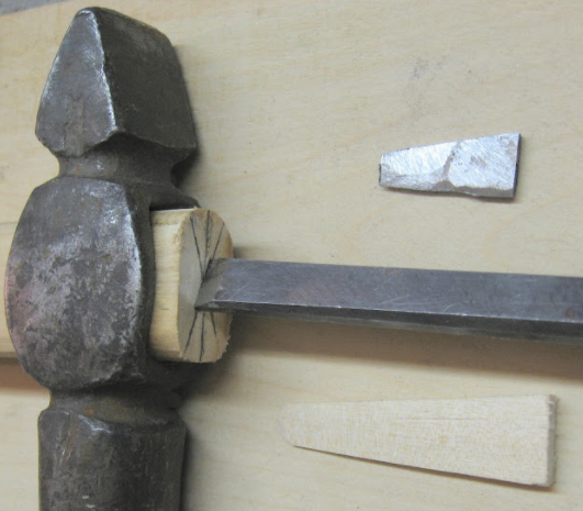 Деревянный клин делают из смолистой сосны — она хорошо «влипает» в берёзовую рукоятку: толщина около 3 мм, ширина около 15 мм, длина 30–50 мм. Конец клина притуплён, сам он плавно сужается.