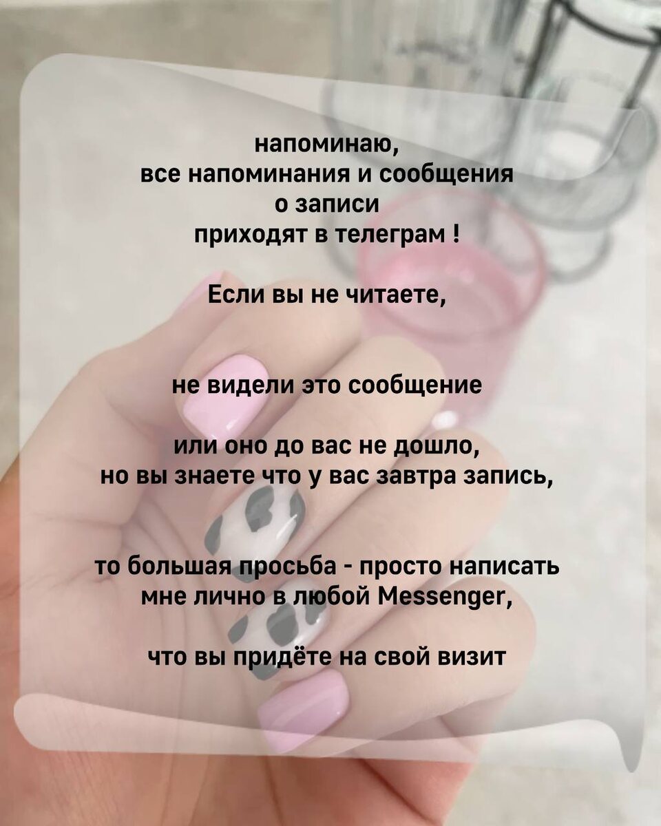 мне с вами связаться. Пока Telegram работает, до с замедлением, но полноценно не отключён и в него сообщения доходят , все напоминания будут приходить в Telegram. Если по какой-то причине вы не видели сообщение, пропустили или я не знаю специально его игнорируете, или что?:) Вы же всё равно, знаете , что вам за сутки приходят напоминания, вы даже не дожидаясь этого сообщения можете мне сами также за день написать придёте вы или нет. ❤️❤️❤️