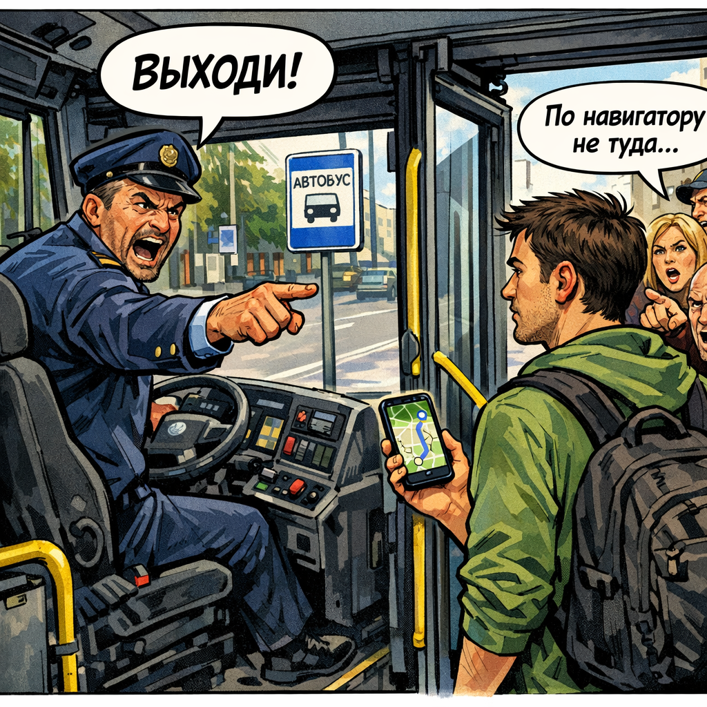История реальная. После неё я понял одну вещь - в общественном транспорте лучше молчать. Потому что если ты начинаешь говорить, рано или поздно тебя высадят. Причём не обязательно на твоей остановке. Утро. Обычный городской автобус. Набит так, что если один человек выйдет — остальные упадут, потому что держались за него. Стою возле кабины водителя, потому что дальше пройти нельзя — там уже не пассажиры, там геология. Едем. Едем долго. Очень долго. Смотрю в окно, потом снова в окно, потом снова в окно. И начинаю ловить странное ощущение, что мы уже где-то это видели. Проезжаем магазин с огромной надписью «Скидки на окна 70%». Через пару минут — опять он. Думаю — ладно, показалось. Едем дальше. Снова этот же магазин. Я уже достаю телефон, открываю карту, смотрю маршрут и вижу, что мы вообще едем как-то не туда. Наклоняюсь к водителю, говорю спокойно: Он резко тормозит. Так резко, что у половины автобуса внутренний GPS перезагрузился. Медленно поворачивается: Он смотрит на меня так, будт