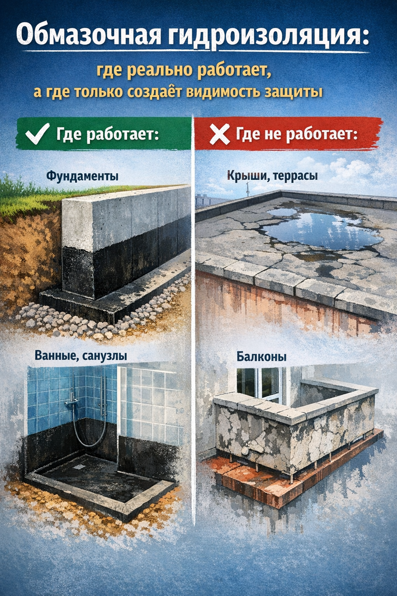 Вот здесь и проходит граница между настоящей защитой и её имитацией. Обмазочная гидроизоляция работает там, где вся система собрана правильно. А там, где ею пытаются заменить отсутствие инженерного решения, она просто даёт красивую отсрочку.