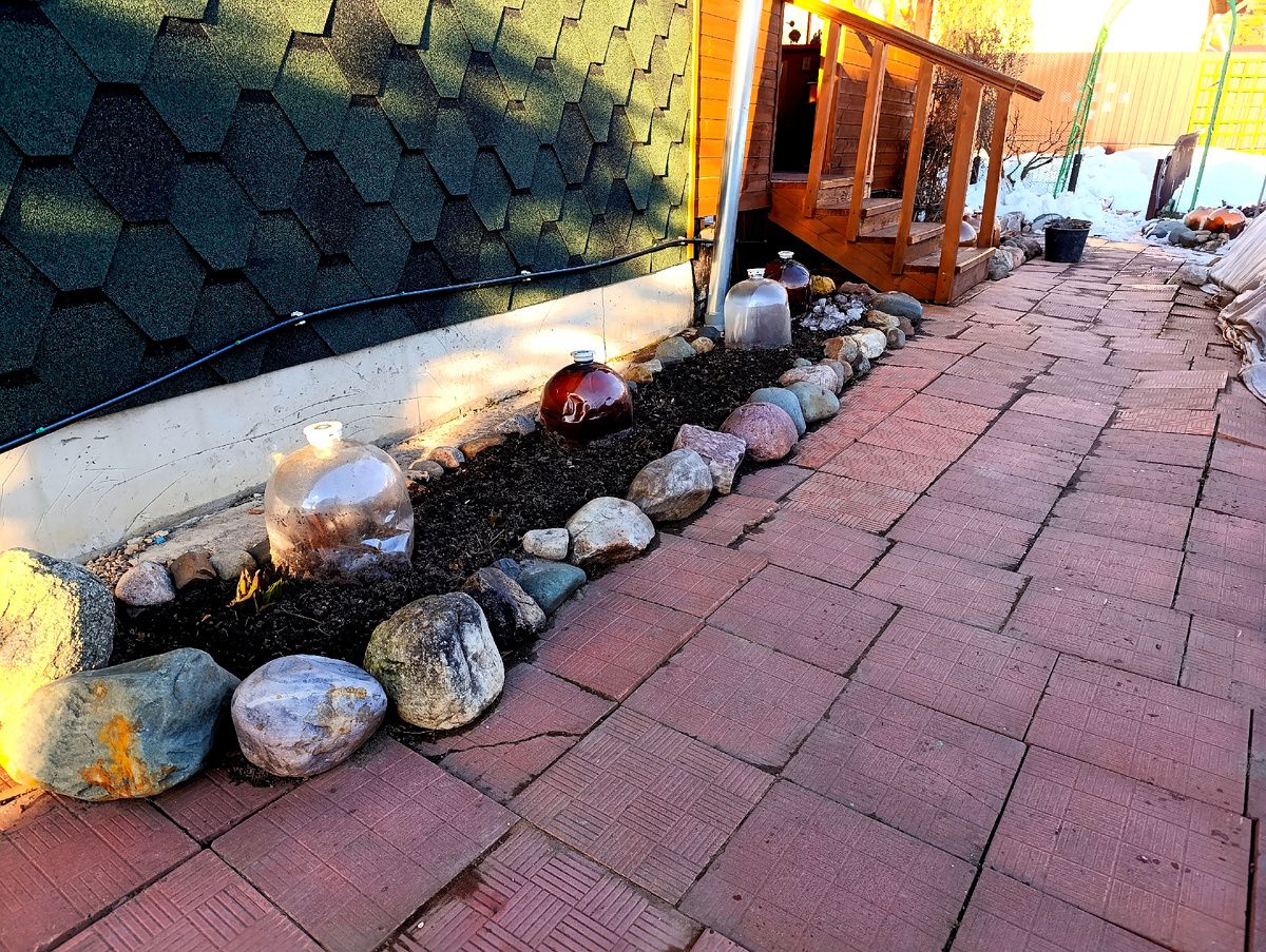 Сегодня я решила немного прибраться во дворе, где уже растаяло. В данный момент это всего две клумбы вдоль дома. Они весь день на солнце, и снег сошел полностью.