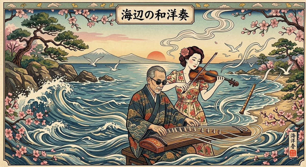 Когда слепой мастер Митио Мияги (宮城 道雄, 1894–1956) в 1929 году представил своё новое произведение и японское музыкальное сообщество буквально раскололось. Консерваторы вознегодовали. Как говорит одна моя знакомая — «аж шерсть дыбом!». Мияги посмел смешать строгие каноны японской классики с западными интервалами и аккордами. Для них это было «грязным шумом» и выглядело так, будто в древний храм притащили граммофон и начали крутить джаз. Так появилась «Весеннее море» (Haru no Umi / 春の海) — пьеса для кото и флейты сякухати. Это не просто «музыка для медитации», под которую приятно пить чай, а попытка человека, потерявшего зрение в детстве, воссоздать мир через звуки. Кото здесь передает мягкий плеск воды, а флейта — крики чаек и тот самый колючий, но уже теплеющий весенний ветер. Как-то, будучи на гастролях в 1932 году в Японии, французская скрипачка Рене Шемэ услышала эту мелодия и была очарована. Она тут же переложила партию флейты для скрипки. И уже в дуэте с самим Мияги они записали ве