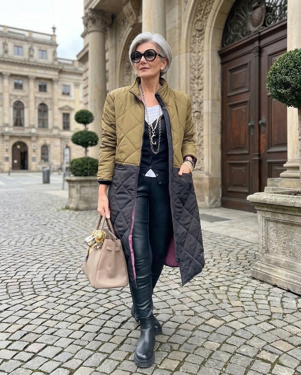 Почему монохром работает: единая цветовая гамма создает непрерывную вертикаль, визуально вытягивая силуэт. Разные фактуры (трикотаж, шерсть, стеганая ткань) добавляют глубину без визуального шума.