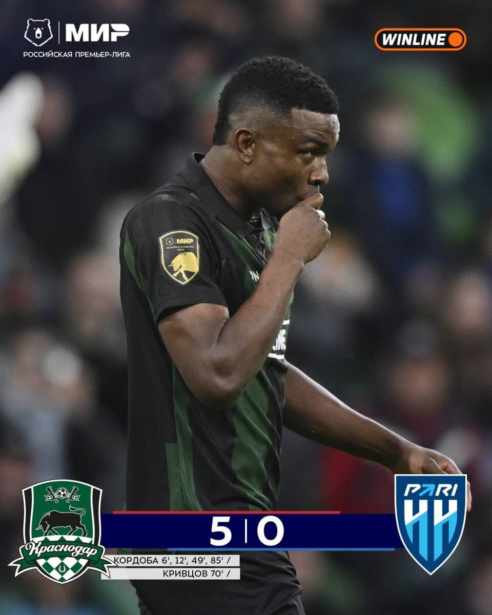 🔥 Покер Кордобы принёс «Краснодару» разгромную победу над «Пари НН» в матче РПЛ