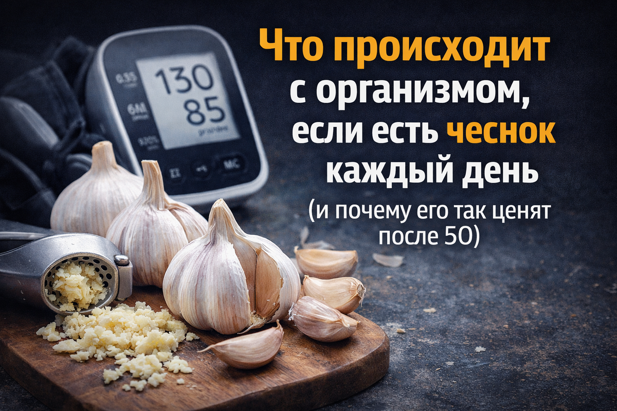 Чеснок — один из самых недооценённых продуктов. Он стоит копейки, лежит почти на каждой кухне, но по своему воздействию на организм может конкурировать с дорогими добавками. Именно поэтому его так часто советуют людям после 45–50 лет. Но что на самом деле происходит, если есть чеснок каждый день? Разберём без мифов и «народных сказок». Это один из самых доказанных эффектов чеснока. Главное вещество — аллицин. Именно он: По данным исследований, регулярное употребление чеснока может умеренно снижать артериальное давление. 👉 Особенно это важно после 50, когда давление начинает «ползти вверх» даже у тех, кто раньше не жаловался. Чеснок влияет на уровень холестерина. Что происходит: Это не мгновенный эффект, но при регулярности он заметен. 👉 Поэтому чеснок часто включают в питание для профилактики атеросклероза. Не случайно чеснок едят при простуде. Он содержит: Что это даёт: Но важно понимать: чеснок — не «лекарство от всего», а поддержка. Есть данные, что чеснок: Особенно это актуально