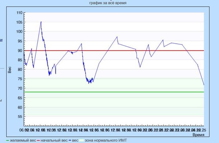 Лет в 30 я вдруг посмотрела на себя в зеркало. Во мне было около 90 кг красоты, я решила, что это многовато. Начала что-то читать по теме, наткнулась на книжки Екатерины Меримановой, Лисси Муссы. Совершенно не помню, что конкретно нужно было делать, у каждой была какая-то система. Я загоралась, начинала следовать советам из этих книжек, вес шел вниз, но и так же быстро остывала и все бросала, вес возвращался. Лет в 35 я отправилась в Борменталь, прошла их программу, где меня научили считать калории, определили коридор калорийности, научили есть 5-6 раз в день. Сейчас вспоминаю это период, как самый большой кошмар, связанный с питанием. С мешком каких-то контейнеров (а как по-другому – ни в магазине что-то готовое купить, ни в кафе не посчитать), вечно думающая о том, что бы и где бы съесть что-нибудь. С утра до вечера в голове только мысли о еде. Следующие 15 лет с переменным успехом я предпринимала какие-то попытки постройнеть, я худела, потом мне надоедало и я толстела, и так по кругу. Вес колебался от 74 до 105 (зарегистрированный максимум), но тяготел к 90.