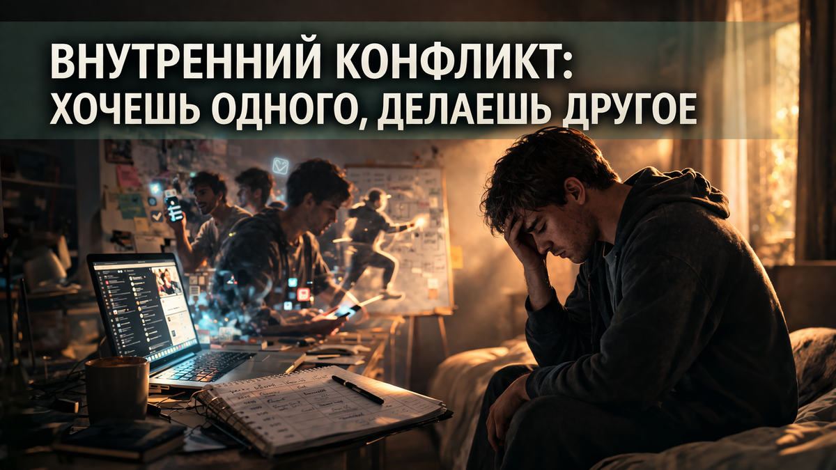 Ты ведь наверняка это знаешь состояние: головой хочешь одного, а по факту день за днём делаешь совсем другое. Хочешь больше денег — но снова тратишь время в никуда. Хочешь поменять жизнь — но цепляешься за старый ритм. Хочешь уважать себя — но снова сливаешься в то, от чего потом сам устаёшь. И самый мерзкий вопрос здесь даже не «почему я не могу?», а «почему я как будто сам себе мешаю?» Снаружи это часто выглядит как слабость, лень или отсутствие характера. Но внутри всё устроено сложнее. Человек может искренне хотеть изменений и одновременно бояться всего, что за ними стоит. Потому что любое настоящее движение — это не только шанс на лучшее, но и риск: ошибиться, потерять привычную опору, столкнуться с собой без оправданий. Одна часть тебя хочет вырасти. Другая хочет выжить без резких движений. Одна тянется к новой жизни. Другая шепчет: «не лезь, потом, не сейчас, ещё не время». И пока внутри нет ясности, человек начинает жить в странном раздвоении: мечтает об одном, а обслуживает со