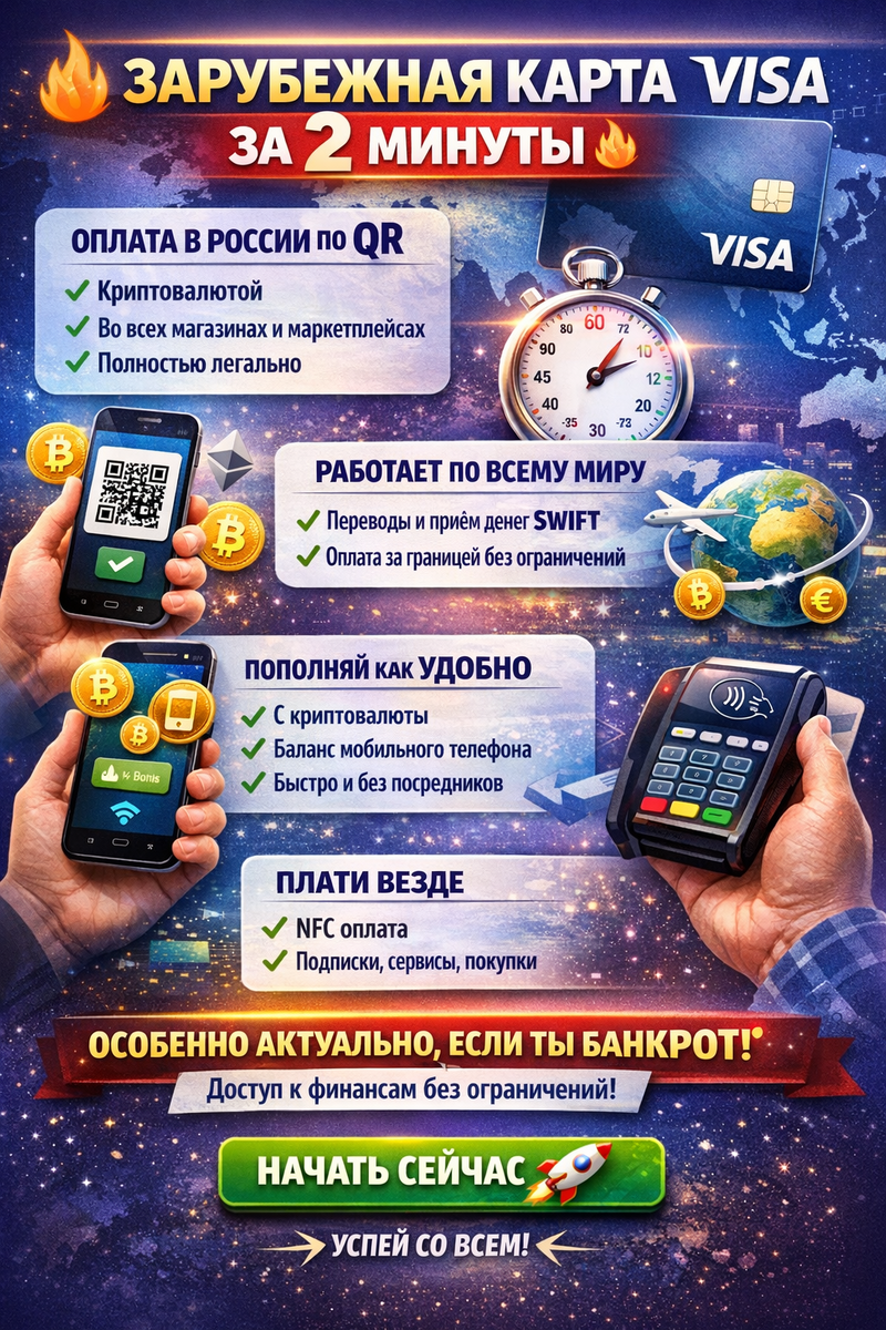 В сегодняшней России, когда долги давят, а привычные банковские инструменты заблокированы, банкротство не приговор. Это не конец, а новый старт! Специально для тех, кто прошёл процедуру банкротства или только собирается, появилась простая и полностью законная возможность — оформление зарубежного счёта прямо из России. Всё занимает за 2 минуты. Без очередей, без визитов в офисы и без лишних документов. Просто переходите по ссылке, регистрируетесь и получаете зарубежный счёт из России, который работает как полноценная международная карта Visa. Самостоятельное пополнение рублями больше не проблема. Вы можете делать это по СБП мгновенно или через банковский счёт — деньги приходят быстро и без конвертации по невыгодному курсу. Управлять всем удобно: либо в управление в телеграм боте, либо скачайте приложении в Google Play и контролируйте баланс с телефона. Самое крутое — оплата в России по QR с криптовалюты! Теперь вы можете расплачиваться в во всех магазинах, супермаркетах, кафе и даже на