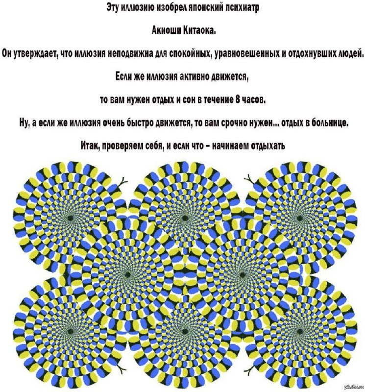🔸🔸🔸🔸 🔴НУЖЕН ЛИ ТЕБЕ ОТДЫХ?⬅️🤔 Давайте сегодня вместе пройдем небольшой тест на состояние усталости. Эту иллюзию изобрел японский психиатр Акиоши Китаока, Он утверждает, что иллюзия неподвижна для спокойных, уравновешенных и отдохнувших людей. Если же иллюзия активно движется, то вам нужен отдых и сон в течение 8 часов. Ну, а если же иллюзия очень быстро движется, то вам срочно нужен.. отдых в больнице. Итак, нажимая на картинку, проверяем себя, анализируем и если что - начинаем отдыхать 😉 🔴Делаю тест не первый раз. Он всегда показывает реальное состояние, рекомендую - доверьтесь его результатам. Как вы чувствуете себя сейчас? Есть ли у вас ощущение "иллюзорности" происходящего, словно вы в тумане? Или вы полны сил и энергии? У меня сегодня есть небольшое движение и я чувствую, что немного подустала, нуждаюсь в отдыхе. Пойду гулять в парк, перезагружаться Уверена, что многие из вас испытывают нечто подобное. Предлагаю вам сейчас, не откладывая на потом сделать одну важну