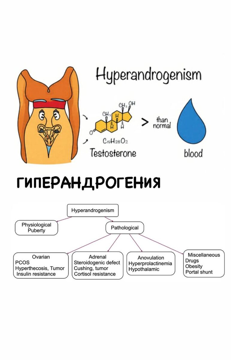 рекомендую обратить внимание на этот гормональный дисбаланс, поскольку он несёт риск бесплодия и развития диабета. Симптомы гиперандрогении - нерегулярный менструальный цикл - рост волос по мужскому типу - алопеция - себорея - гирсутизм - жирная кожа головы/лица - высыпания на лице и на теле (акне, угри, возникающие в постпубертатном периоде в форме комедонов, папул и кист, которые могут воспаляться и оставлять после устранения пигментные рубцы) - стрии - бесплодие У многих пациенток наблюдаются депрессивное подавленное состояние и избыточная масса тела (35–60% случаев). ВАЖНО! Гиперандрогения очень часто связана с инсулинорезистентностью (ИР). Уже писала об этом в прошлом посте и опять спрашивают, что делать. ИР приводит к компенсаторной гиперинсулинемии, которая существенно увеличивает синтез андрогенов яичниками путём увеличения частоты секреции ЛГ. Под воздействием ЛГ возникает гиперандрогения. А увеличение количества андрогенов в яичниках может ухудшить течение ИР, формируя п