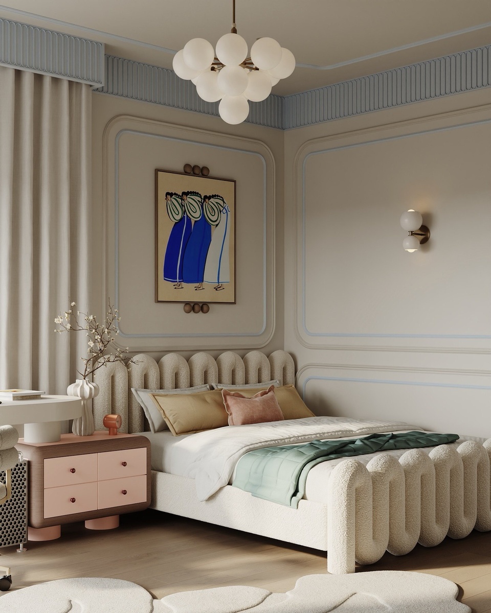 Дизайнеры создали интерьер, который балансирует на грани функционального жилья и галереи современного искусства. Это не просто комната для ребенка – это пространство, которое воспитывает вкус и чувство формы.