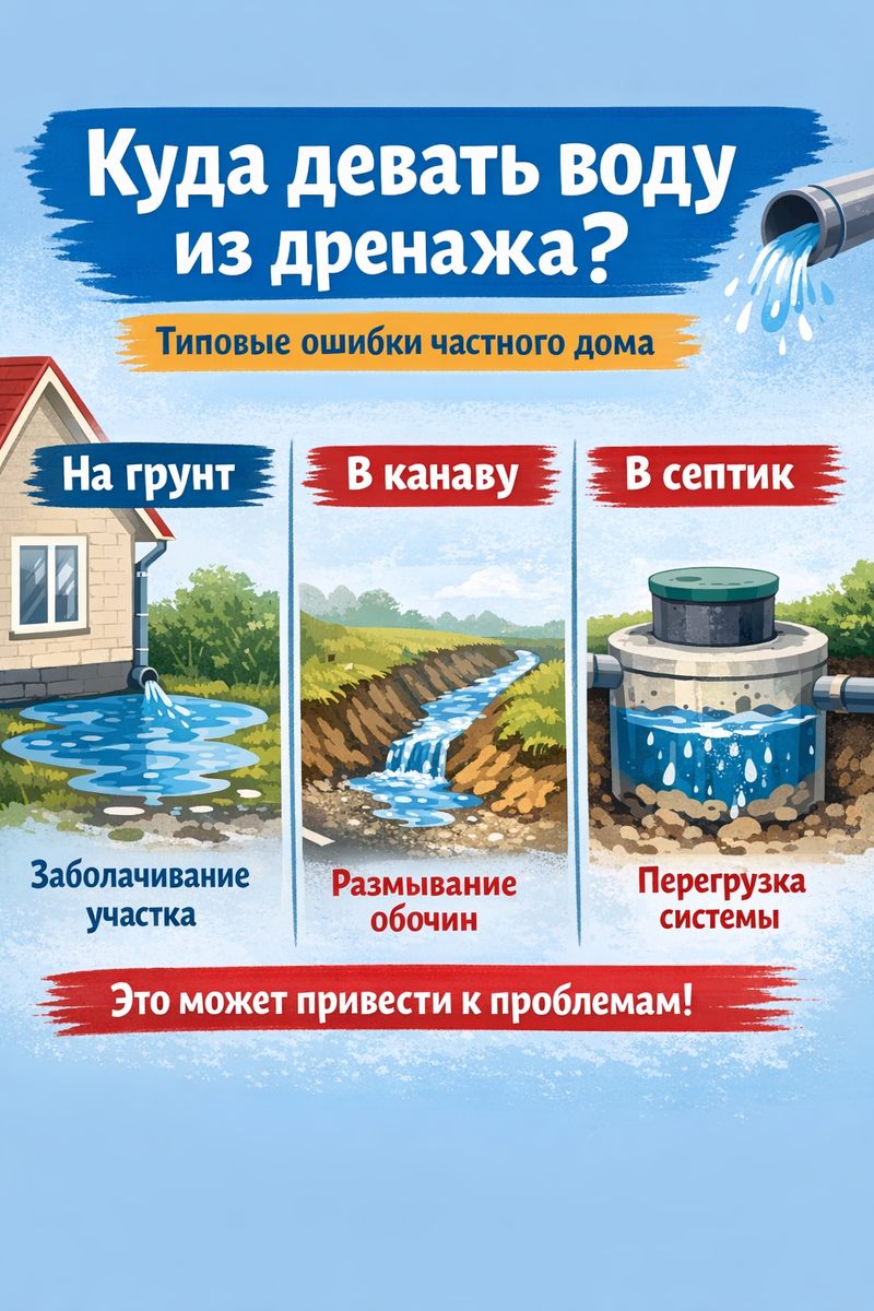 Если коротко, дренаж без понятного сброса — это не законченная система, а только половина работы. Самые типовые ошибки частного дома здесь простые: вывести воду в слабую яму, на неверный рельеф, в перегруженный общий узел или в точку, которая красиво выглядит только до первого серьёзного дождя.