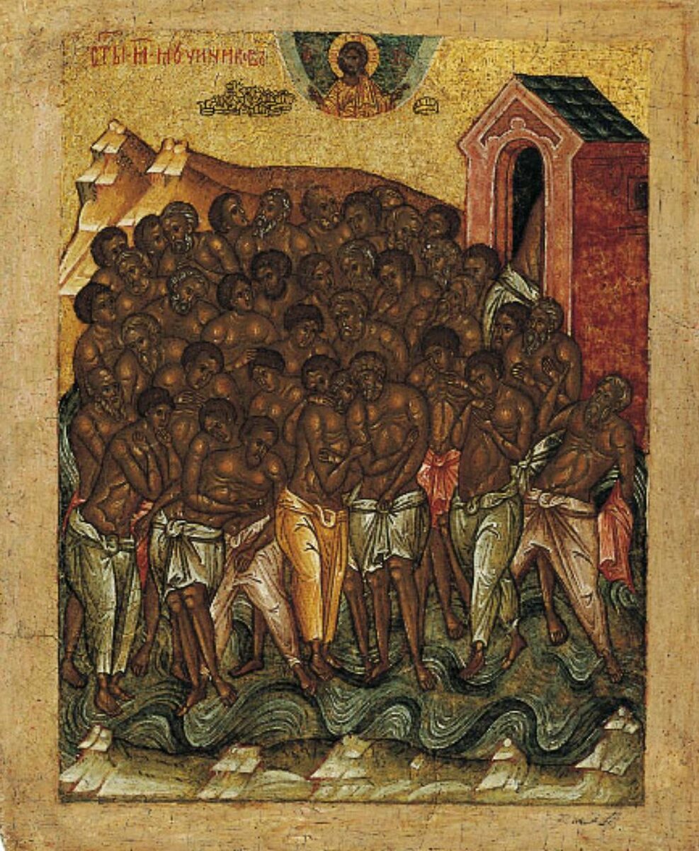 ? 40 севастийских мучеников были римскими воинами, жившими в начале IV века. За свою веру во Христа в 320 году они были арестованы. Их оставили замерзать ночью в ледяном озере возле города Севастии (совр. Сивас на территории Турции), но они стойко выдержали испытания и погибли, не отрекшись от веры. Один из воинов не выдержал и, оставив своих единоверцев, бросился в баню, которую растопили у озера. Но едва войдя туда, тут же упал замертво. Остальные стояли в озере всю ночь. Под утро солдат, который их охранял, увидел, как с неба на них спускаются 39 венцов. Пораженный видением, он уверовал во Христа, присоединился к воинам, стоявшим в воде, встал на место их отпавшего собрата и вместе с остальными был удостоен мученического венца. В этот день обязательно совершается Литургия. Даже если день памяти сорока мучеников, который всегда выпадает на Великий пост, приходится на понедельник, вторник или четверг, когда литургии не положено, все равно служится литургия Преждеосвященных Даров