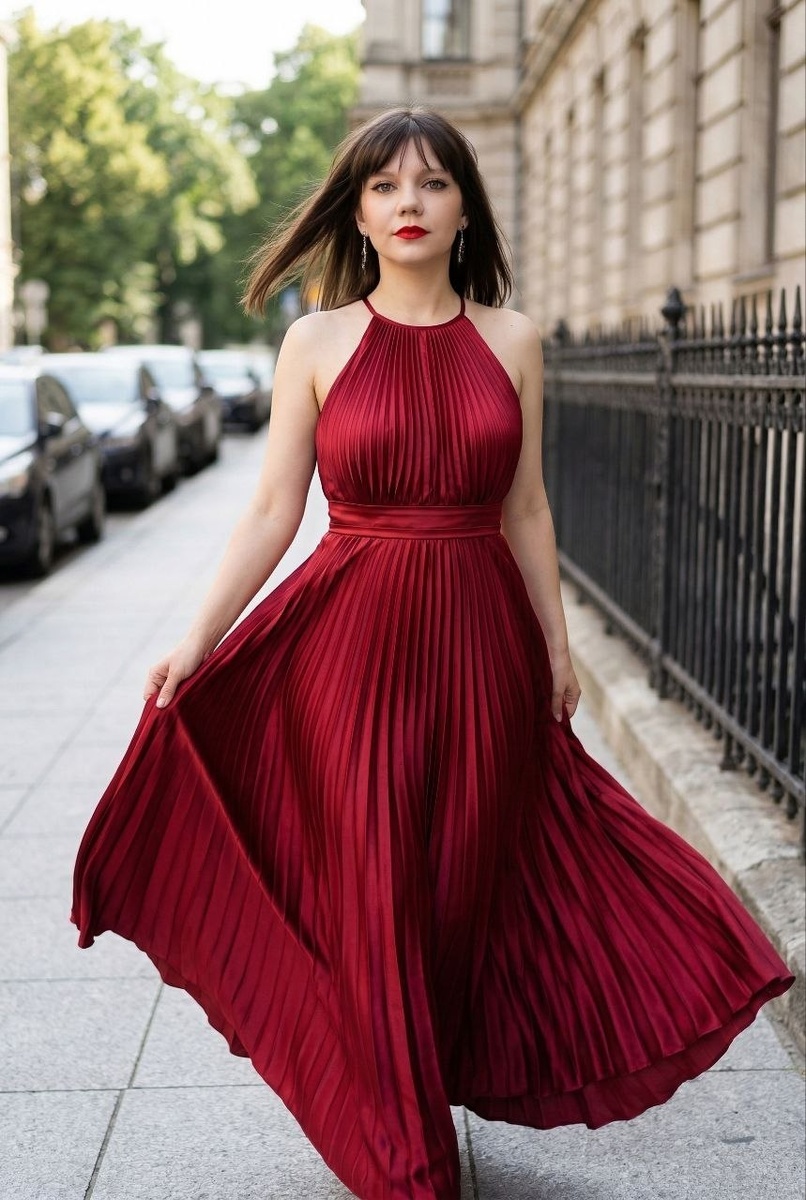 от подписчика Используй прикреплëнное фото человека как референс - перенеси внешность этого человека точь-в-точь, сохраняя черты лица, форму головы, цвет волос, глаз, кожи и все уникальные особенности. Фотореалистичная вертикальная фотография в полный рост стройной молодой женщины; макияж — яркая красная помада, аккуратная чёрная стрелка «cat-eye», выразительные ресницы, волосы развиваются назад, чёткие брови; изящные серьги-подвески; длинное вечернее платье насыщенного бордового/карминового цвета из атласа, тонкая микроплиссировка по всей длине, верх — закрытый top с американской проймой (halter), подчёркнутая талия, широкий струящийся подол; она динамично идёт по тротуару и правой рукой слегка поднимает край платья — динамичные волны ткани, глубокие тени между складками, сияние атласа; уверенная осанка, взгляд прямо в камеру; окружение: европейская городская улица, светло-серый каменный тротуар, справа кованая чёрная ограда и фасад исторического здания, на заднем плане размытые авто