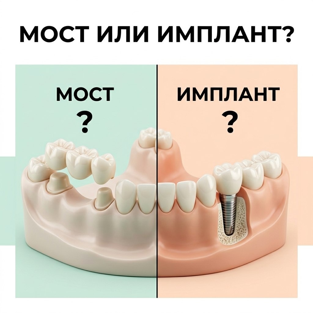 ? 🦷 Частый вопрос в Директ: «Зачем имплант, если можно поставить мост? Это же быстрее и дешевле». Отвечаю как врач с 24-летним стажем. Поставить — можно. Но нужно понимать физику процесса, о которой редко рассказывают пациентам. 📍 В чем подвох? Наша нижняя челюсть — это не монолитный кусок бетона. Она живая и эластичная. При каждом открывании рта или жевании мышцы тянут её так, что кость совершает микро-изгиб «винтом». Что происходит с мостом: Мы берем два здоровых зуба, обтачиваем их и надеваем сверху жесткую конструкцию (мост). Кость продолжает пружинить, а металлокерамика — нет. Она стоит намертво. Из-за этой разницы в движении слой цемента, на котором держится мостик, постепенно разрушается и вымывается. Особенно под дальней коронкой. ❌ Итог: Образуется невидимая щель. Туда попадает слюна и микробы. Зуб под визуально целой коронкой начинает гнить. Вы этого не чувствуете, пока мост не выпадет вместе с разрушенным корнем. Почему имплант — это стратегия выигрыша? ✅ Он стоит