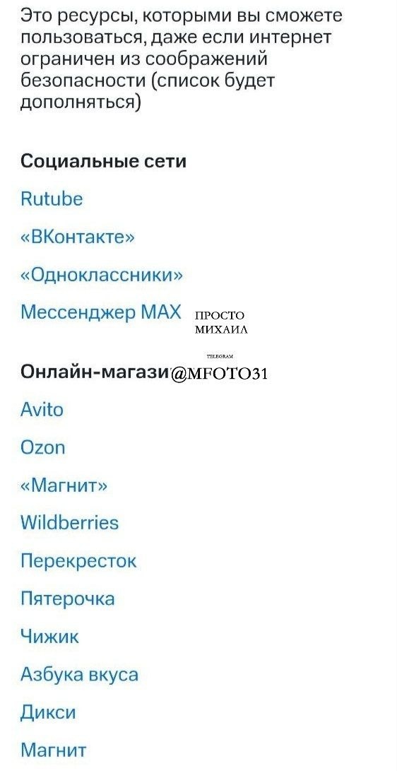 Список "белых ресурсов" работающих при ограничении интернета от МТС