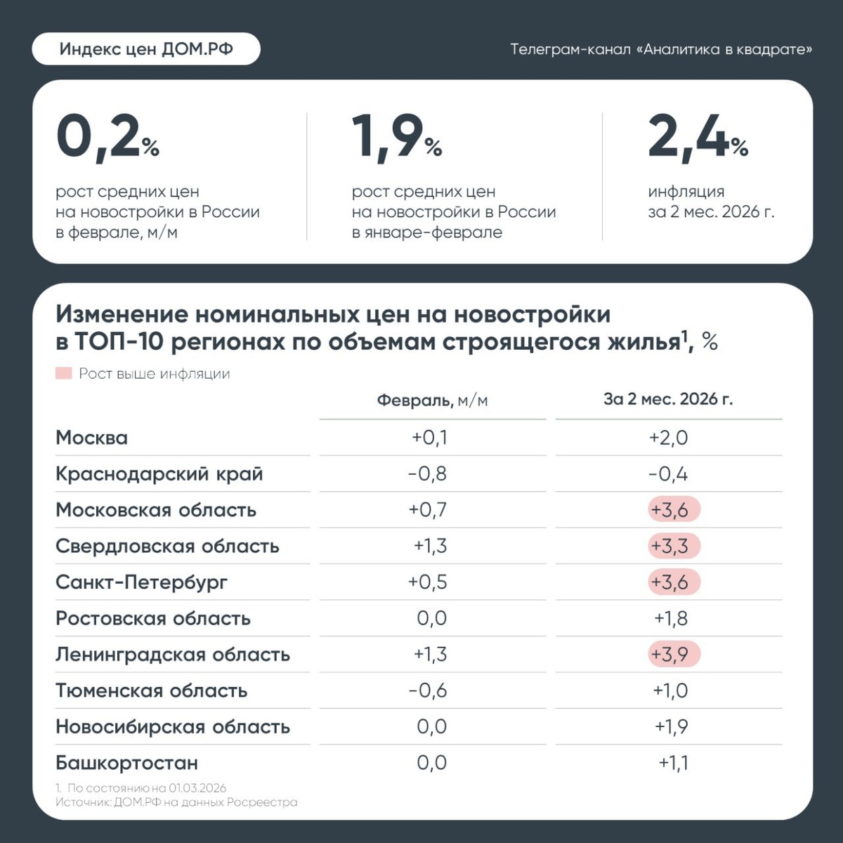 Февраль показал очень спокойную динамику по рынку первички. Цены выросли всего на 0,2% за месяц. Фактически это стагнация. 📊 Где рост всё-таки есть Интересно, что дорогие сегменты снова ведут рынок. • бизнес и элит — +0,6% м/м • комфорт и типовое — +0,2% м/м Разрыв в 3 раза. Но если смотреть на год, картина обратная: • массовый сегмент — +11,2% г/г • бизнес/элит — +9,2% г/г То есть основной рост всё ещё в «массе». 📍 Неожиданные регионы-лидеры Обычно рост бизнес-класса ждут в Москве и Питере. Но в феврале всё иначе: • Амурская область — +14,4% м/м • Рязанская область — +11,1% м/м Редкий случай, когда регионы резко обгоняют столицы. 🏢 Что по форматам квартир За месяц сильнее всего выросли: • трёхкомнатные — +0,5% м/м • однокомнатные — +0,1% м/м Но по году всё наоборот: • «однушки» — +12,5% г/г • «трёшки» — +8,1% г/г Спрос по-прежнему концентрируется в более доступных форматах. 🏙 Москва почти замерла • общий рост — +0,1% м/м • массовое жильё — -1% м/м • элитное —