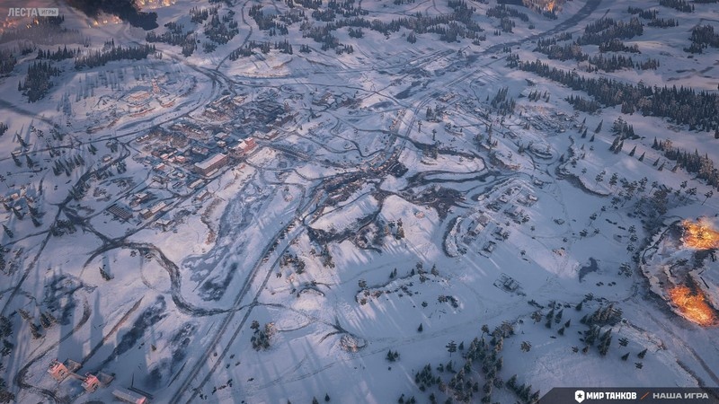 - Открытая местность: на противоположном берегу — снежные поля и редкие заборы/лесопосадки. Это пространство лучше подходит для манёвренных прорывов, обходных атак и расстрела противника на дистанции.