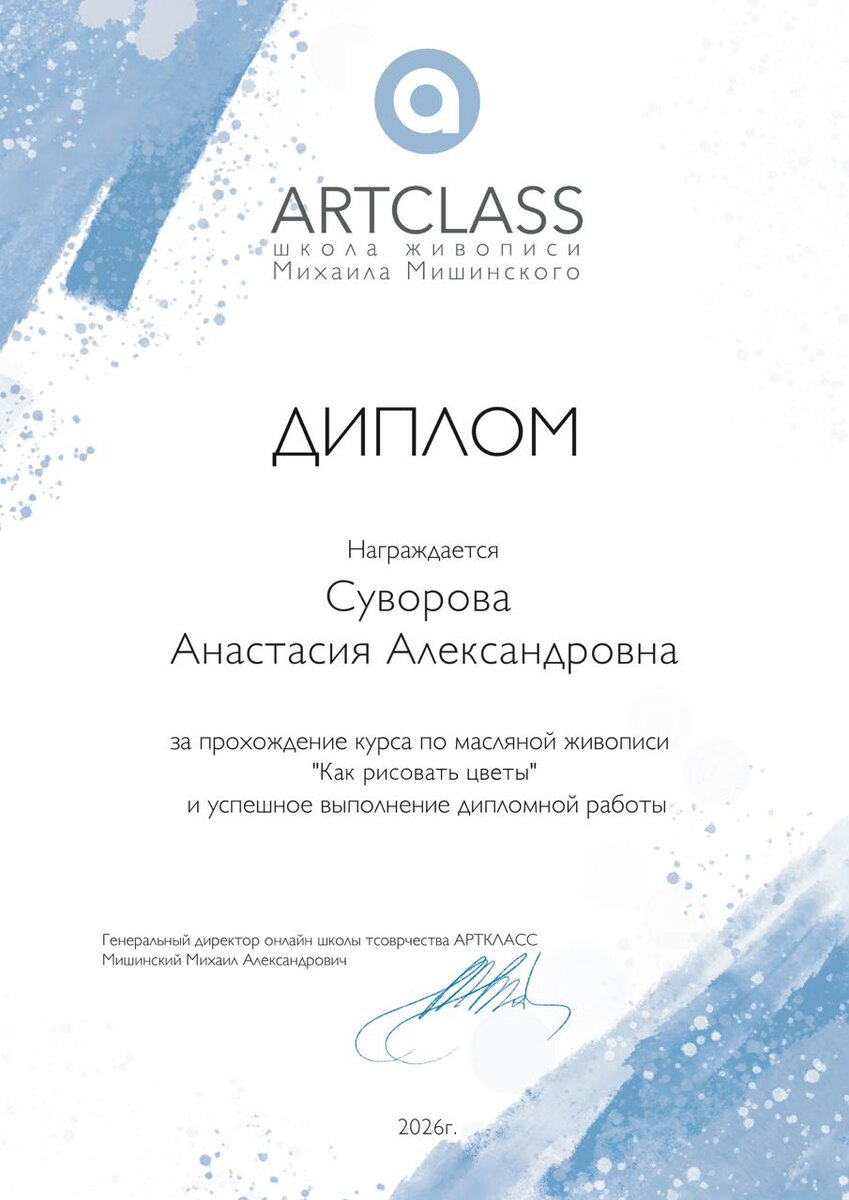 Поздравляем Анастасию с завершением курса «Как рисовать цветы», успешным завершением дипломной работы и получением диплома!!! https://paint.art-class.online/bigflowerscourse?utm_source=tg_post