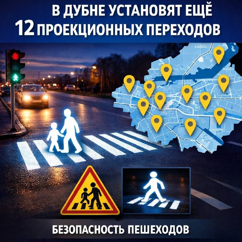 👣💡 Первые «светящиеся» проекционные переходы появились в городе ещё в 2024 году — тогда такой переход установили рядом с Хоровой школой мальчиков и юношей «Дубна». Уже в 2025 году технологию расширили: подсветка появилась сразу по 13 адресам. И на этом решили не останавливаться — в 2026 году в Дубне планируют обустроить ещё 12 проекционных переходов 🚦 Вот где они появятся: 📍 проспект Боголюбова — пересечение с улицей Интернациональной 📍 улица Векслера — напротив Дома культуры «Мир» 📍 улица Володарского — пересечение с улицей Карла Маркса 📍 улица Володарского — участок у поликлиники Дубненской городской больницы 📍 улица Звёздная — рядом с детским садом «Созвездие» 📍 улица Макаренко — напротив Смоленской церкви 📍 улица Попова — пересечение с улицей Правды 📍 улица Свободы — от детских садов «Рябинка» и «Семицветик» к 2-му Театральному проезду 📍 улица Строителей — от дома №14 к набережной 📍 улица Тверская — пересечение с улицей Войкова 📍 улица Энтузиастов — напротив бассе