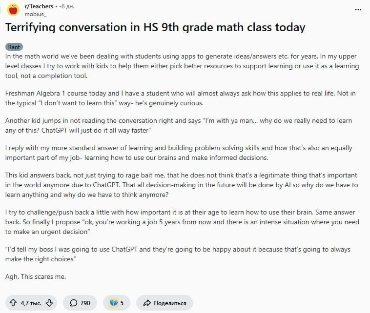 Одна преподавательница рассказала, как ученик прямо заявил: учиться ему не нужно, ведь в будущем всё будет делать нейросеть. Даже аргумент про реальные задачи на работе не зашёл — парень уверен, что просто скажет начальнику про ChatGPT и получит похвалу, потому что ИИ «сделает лучше». Ну вот и приехали. Подробнее: https://hard-tm.su/threads/154386/ 🕹HARD-TM — Подписаться