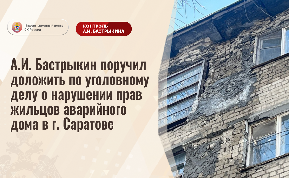 А.И. Бастрыкин поручил доложить по уголовному делу о нарушении прав жильцов аварийного дома в г. Саратове В сети Интернет сообщается о длительном нерасселении жильцов многоквартирного дома во 2-м Кавказском тупике в городе Саратове. Пятиэтажное здание 1962 года постройки находится в непригодном состоянии: конструкции, оконные проемы и кирпичная кладка фасада разрушаются. Несмотря на признание строения аварийным в 2023 году, мер к предоставлению гражданам благоустроенного жилья не принимается. В СУ СК России по Саратовской области возбуждено уголовное дело. Председатель Следственного комитета Российской Федерации Александр Иванович Бастрыкин поручил руководителю СУ СК России по Саратовской области Дмитрию Александровичу Костину доложить о ходе и результатах расследования уголовного дела. Исполнение поручения поставлено на контроль в центральном аппарате ведомства. #СледственныйКомитет #СКРоссии #СКР #ИЦСКР #ИнформационныйЦентр #АлександрБастрыкин #ПредседательСКР #КонтрольПредседателяС