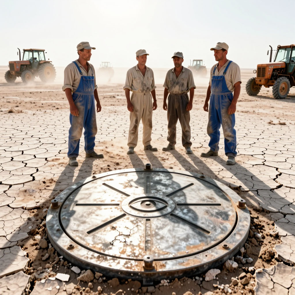 В 1972 году, в жаркое лето, когда реки в Казахстане мелели, а скот падал от жажды, пересохло озеро Кара-Тюбе, что в пустыне Мойынкум. Оно никогда не было большим — скорее, широкая лужа с солоноватой водой, где пастухи водили стада. Но когда вода ушла, на дне обнаружилось нечто, что не должно было быть там никогда. Трактористы, работавшие на распашке новых земель, наткнулись на металлический люк. Не ржавый, не покоробленный — идеальный, как будто его установили вчера. Диаметром — три метра. Края запаяны так плотно, что даже под ножом не было щели. На поверхности — выбит символ: круг с тремя линиями, расходящимися внутрь, как глаз, смотрящий вглубь.