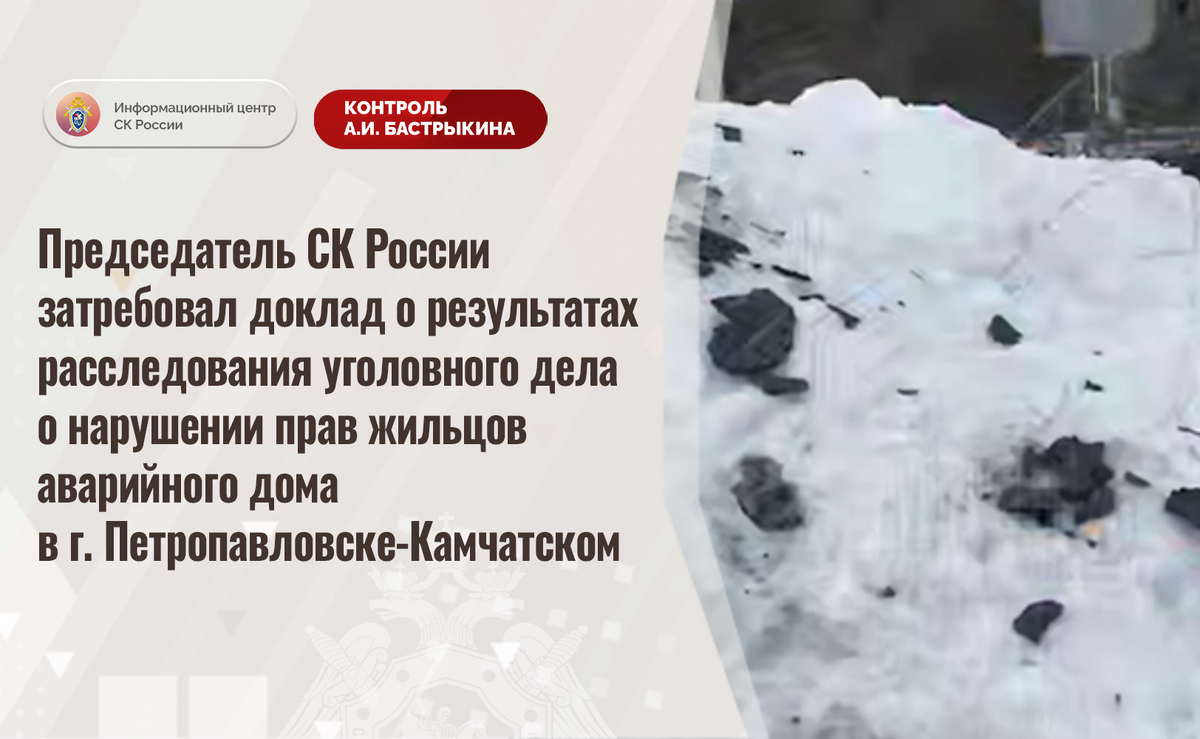 Председатель СК России затребовал доклад о результатах расследования уголовного дела о нарушении прав жильцов аварийного дома в г. Петропавловске-Камчатском В СМИ сообщается о длительном нерасселении жильцов многоквартирного дома на улице Курильской в городе Петропавловске-Камчатском. Здание 1966 года постройки находится в непригодном состоянии из-за разрушающегося фасада, элементы которого падают на тротуар, что представляет опасность для прохожих. Несмотря на признание строения более 9 лет назад аварийным, до настоящего времени благоустроенные жилые помещения гражданам не предоставлены, сроки расселения не сообщаются. В СУ СК России по Камчатскому краю расследуется уголовное дело. Председатель Следственного комитета Российской Федерации Александр Иванович Бастрыкин затребовал у руководителя СУ СК России по Камчатскому краю Владимира Владимировича Кулакова доклад о предварительных и окончательных результатах расследования уголовного дела. Исполнение поручения поставлено на контроль в