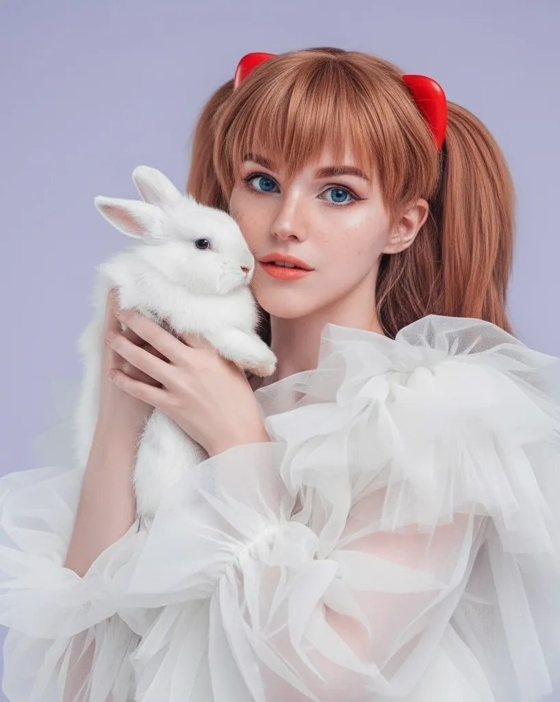 Загрузи свое фото и получи такое же изображение, на котором будешь ты. ✨ Создать фото через сайт ✨ ✨ Создать фото в телеграм боте ✨ Промт для девушки: Нежный портрет персонажа, держащей белого кролика рядом с лицом, близкий эмоциональный контакт человека и животного, мечтательная сказочная эстетика, лёгкое воздушное платье светло-белого цвета с объёмными рюшами и мягкими складками, натуральный минималистичный макияж, спокойное выражение лица, пастельный лавандовый фон, центрированная композиция, симметричный портретный кадр, мягкий рассеянный студийный свет, гладкая кожа, детализированная шерсть кролика, нежная романтическая атмосфера, стиль модной редакционной съёмки (fashion editorial), художественная фотография, малая глубина... Все промты для ИИ на нашем сайте и в телеграм канале #реалистичный #портрет #романтичное #мечтательное #милое #женщина