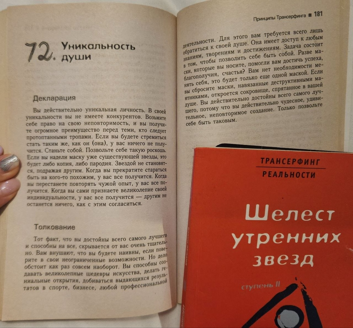 72/78 Практикум управления реальностью - Трансерфинг Уникальность души "Вы действительно уникальная личность. В своей уникальности вы не имеете конкурентов. Возьмите себе право на свою неповторимость, и вы получите огромное преимущество перед теми, кто следует протоптанными тропами. Если вы будете стремиться стать такими же, как он (она), у вас ничего не получится. Станьте собой. Позвольте себе такую роскошь. Если вы надели маску уже существующей звезды, это будет либо копия, либо пародия. Звездой не становятся, подражая другим. Когда вы прекратите стараться быть на кого-то похожим, у вас все получится. Когда вы перестанете повторять чужой опыт, у вас все получится. Когда вы сами признаете великолепие своей индивидуальности, у вас все получится - другим не останется ничего, как с этим согласиться." "Тот факт, что вы достойны всего самого лучшего и способны на все, скрывается от вас очень тщательно. Вам внушают, что вы будете наивны, если поверите в свои неограниченные возможности.