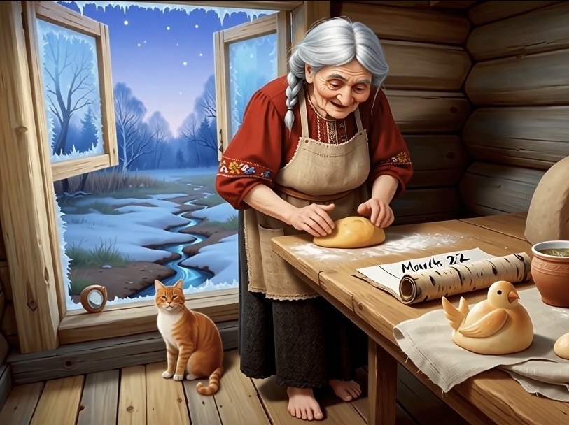 Замесила она тесто. Оно подошло пышное, мягкое, дышащее. Яга отщипнула кусочек, скатала колбаску, завязала узлом — получилась птичка. С одной стороны головка, с другой хвостик. Глазки из изюма сделала, крылышки ножом надрезала, чтобы узорчатые были. Первого жаворонка положила на стол, накрыла полотенцем — пусть подходит.