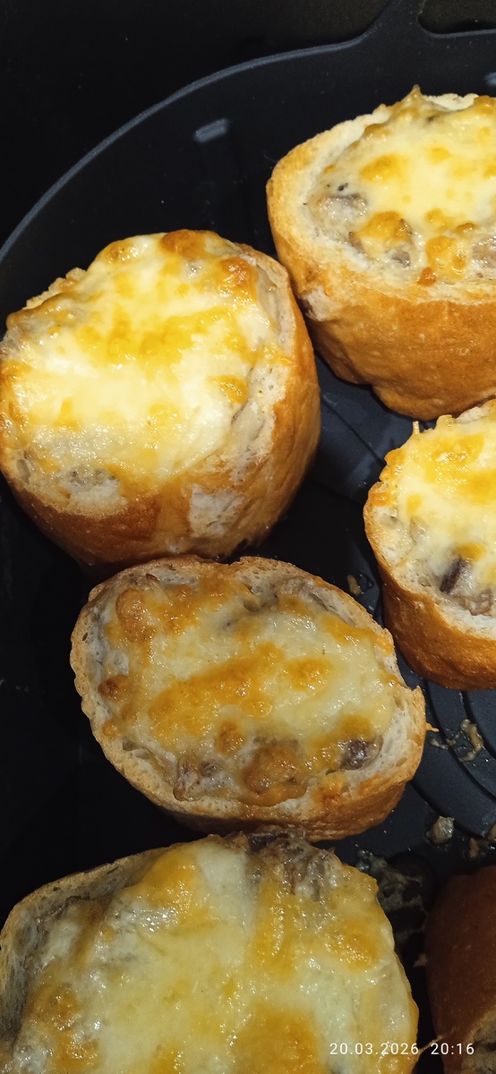 Доброго и бодрого времени суток мои дорогие подписчики. Как и планировала, приготовила жюльен с шампиньонами. Одного багета оказалось мало😁😁😁 Пришлось сходить и купить ещё один. Правда и начинки оказалось маловато, поэтому вместе с луком и шампиньонами я обжарила грудку куриную . Хорошо, что отварила её для супа и салата. Повторюсь. Лук, шампиньоны + отварная куриная грудка-обжарить . Залить сливками и немного в них потушить. Не забыть поперчить и посолить. Если показалось,что жидковато, можно добавить чуть-чуть крахмала. Багет нарезать по 3-4 см и прижарить одну сторону. В последствии эта сторона пойдет на низ. С другой стороны вынуть мякиш. Если начинка густая, то можно оставить практически только стенки багета. Багет наполнить начинкой. Начинку можно придавить, чтоб побольше вошло😁😁 И сверху насыпать сыр. Я его натерла на мелкой терке Поставила в аэрогриль на 4 мин при t 180* Первый раз делала 6 мин, показались жестковаты, как греночки. Можно сделать и в микроволновке. и