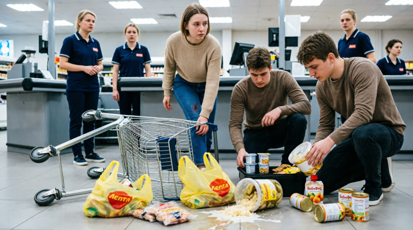Молодые люди помогли аккуратно отодвинуть тележку, собрать продукты обратно на ленту, чтобы ничего больше не упало. Без их помощи я бы просто не справилась.