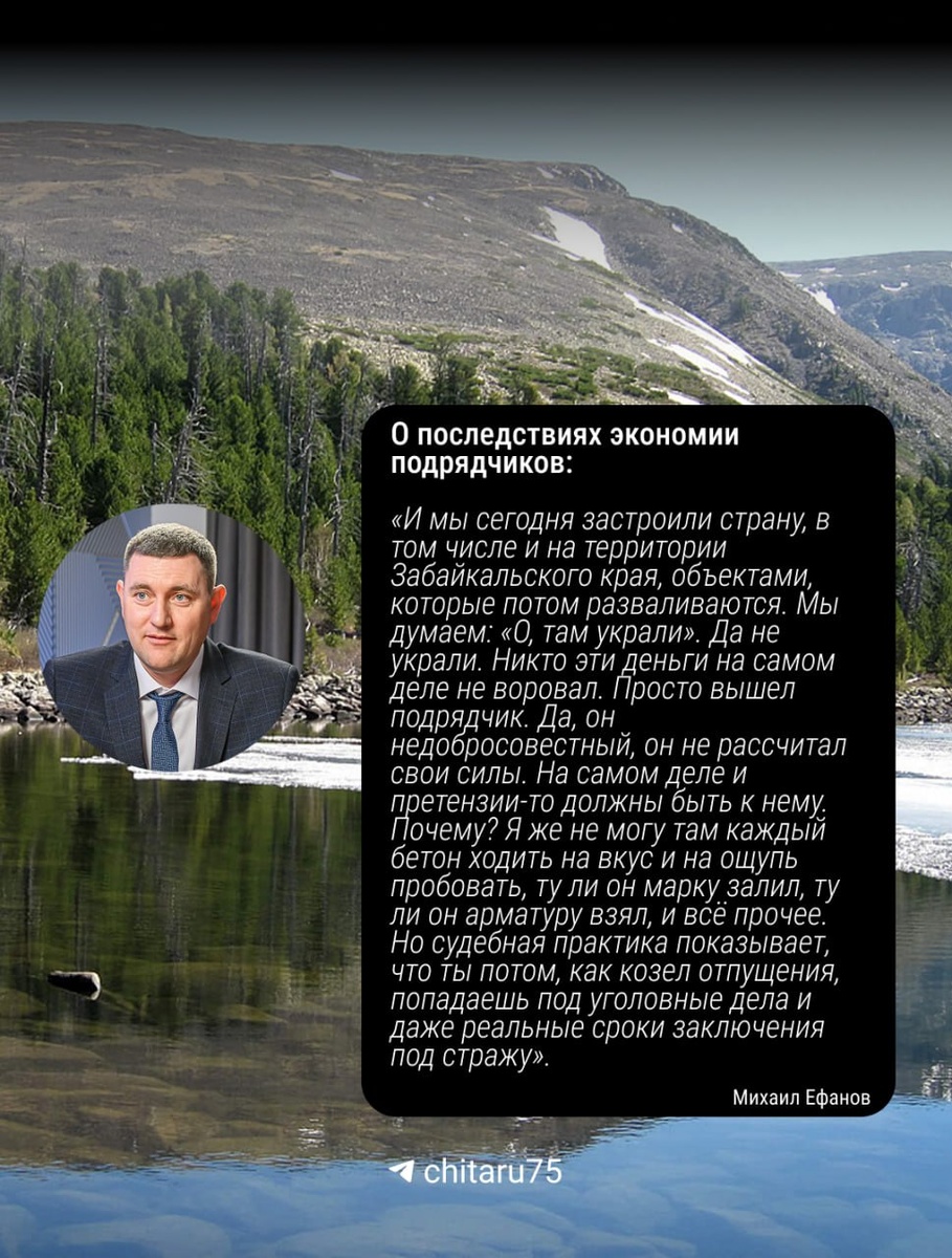 Ефанов в выпуске «Редколлегии» отметил, что закон о контрактной системе в сфере госзакупок нужно дорабатывать и менять, так как сейчас он работает нелогично: Сама система вообще до такой степени несовершенна и застроила нас этими разваливающимися парками или какими-то другими объектами, что надо с этим что-то делать. Пересматривать, по крайней мере, 44-й закон, он давно требует пересмотра. По его мнению, ситуацию давно нужно менять. Например, есть проект — парк, который по смете стоит 100 млн рублей. Госэкспертиза подтверждает, что это его настоящая стоимость, но по закону этот парк будет стоить столько, на сколько цену снизит подрядчик: Абсурдная ситуация. Мы хотим построить объект. Нам все структуры, в том числе госэкспертиза, говорят, что качественный проект будет стоить 100 млн рублей. И нас заставляют идти на аукционы и искать, кто построит этот проект дешевле. Причем нет критерия дешевизны. По словам главы, в Забайкалье бывали случаи, когда из-за этих торгов цену контракта ск