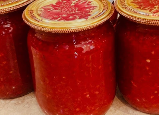 Ингредиенты: - 5 кг помидоров - 1 кг болгарского перца - 1 кг моркови - 4-5 кг свеклы - 4-5 стручков горького перца - 200 г чеснока - 150 г соли - 150 г сахара - 200 г растительного масла - 150 г 6%-ного уксуса Приготовление: Все овощи хорошо промыть, почистить и пропустить через мясорубку. Варить с большой алюминиевой посуде 1,5 часа, постоянно помешивая. В общую массу добавить соль, сахар, растительное масло. За 30 минут до конца варки добавить уксус. Получится 6-7 литров. Разложить аджику в чистые банки и закатать. Поставить под “шубу” на 10 часов. Аджика эта очень густая, остренькая и очень красивого цвета.