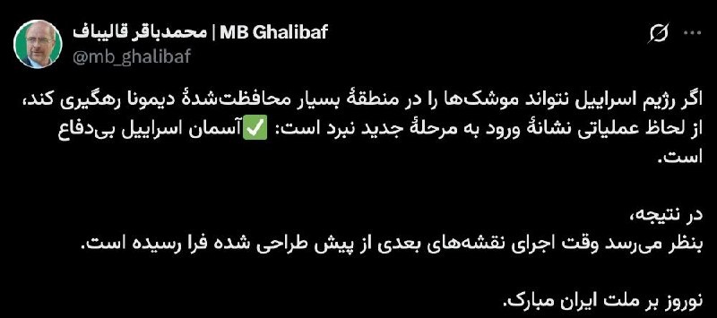Пришло время реализовать следующие заранее запланированные действия, — спикер иранского парламента Галибаф. Если Израилю не удалось перехватить ракеты в тщательно охраняемом районе Димона, это с оперативной точки зрения является признаком перехода в новую фазу сражения: небо над Израилем беззащитно. Следовательно, похоже, пришло время для реализации заранее подготовленных действий.
