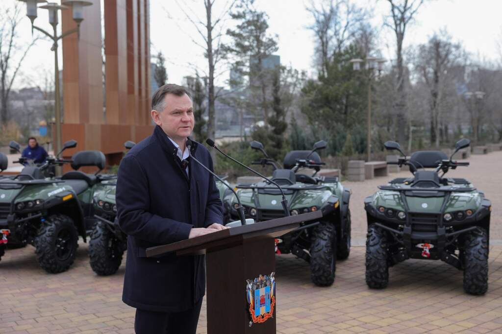 В ростовском парке «Левобережный» прошла церемония передачи спецтехники бригаде управления добровольческого корпуса «Великий князь Владимир». По информации пресс-службы губернатора Ростовской области, Юрий Слюсарь вручил военным десять квадроциклов, которые улучшат их мобильность и эффективность в выполнении особо сложных задач. «Ваша служба требует не только мужества, но и высочайшего профессионализма, чёткости действий, от которых зависят жизни. И вы с этим справляетесь», — обратился к бойцам Юрий Слюсарь. С начала специальной военной операции жители Дона передали военнослужащим сотни единиц автотранспорта и специальной техники, а также несколько тысяч беспилотных летательных аппаратов и различное оборудование для выполнения боевых задач. Фото: donland.ru