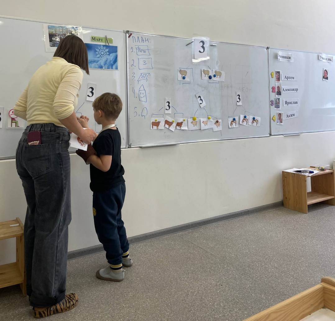 Потом мы пошли в крыло, где расположены классы по программе 8.2, посмотрели классы и поговорили с учителями. Все это время с детьми занимались - корректировали их игры, танцевали и играли.