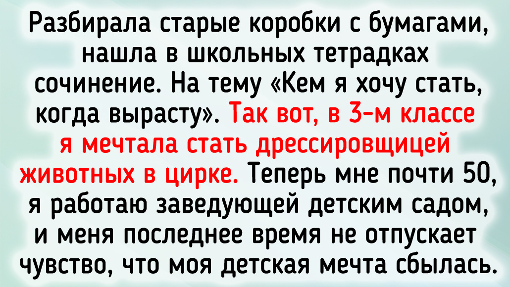 Разбирала старые коробки с бумагами, нашла в школьных тетрадках сочинение. На тему «Кем я хочу стать, когда вырасту». Так вот, в третьем классе я мечтала стать дрессировщицей животных в цирке. Теперь мне почти 50, я работаю заведующей детским садом, и меня последнее время не отпускает чувство, что моя детская мечта сбылась. © NataliCon / Pikabu