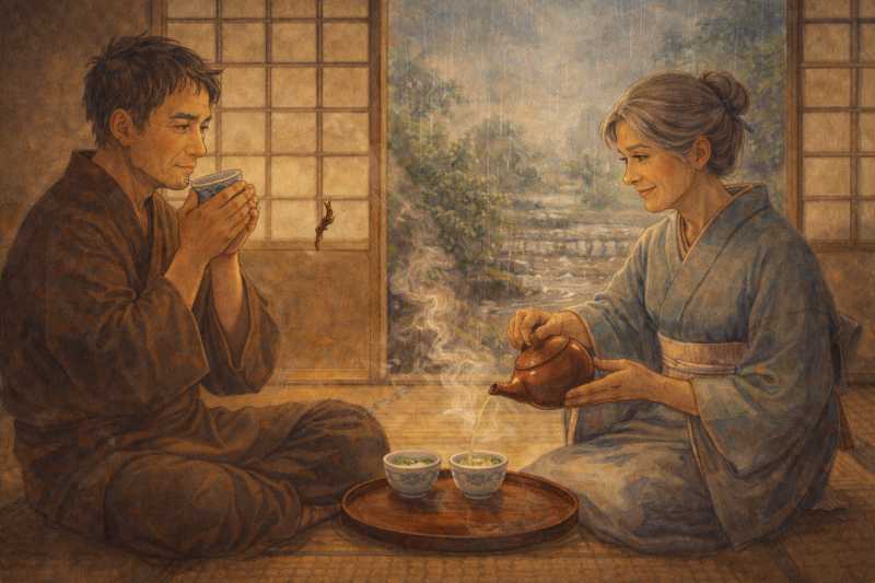 За окном, в саду, моросил мелкий осенний дождь, делая серые камни дорожки темными и блестящими. В комнате пахло старым татами и нагретой водой. Кендзи сидел на полу, поджав ноги, и наблюдал, как его жена Кумико совершает привычный ритуал. Её движения были выверены десятилетиями практики: точно отмерить заварку в глиняный чайник кюсу, остудить кипяток в специальной чаше до нужной температуры — чтобы не обжечь нежный вкус и в нужный момент уверенным, плавным движением разлить готовый изумрудный настой по юноми, добиваясь идеального баланса терпкости и сладости. Кендзи потер ноющее колено. Суставы в такую погоду напоминали старые, несмазанные петли — раздражающе скрипели. — Я старею, Кумико, — сказал он, и его голос прозвучал грустнее, чем он хотел. Он поднял с лакированного подноса одну случайно упавшую сухую чаинку, свернутую в тугую иглу. — Посмотри. Моё тело теперь похоже на этот чайный лист. Такое же скрученное годами работы и забот. Такое же сухое, потерявшее всю влагу и свежесть мо