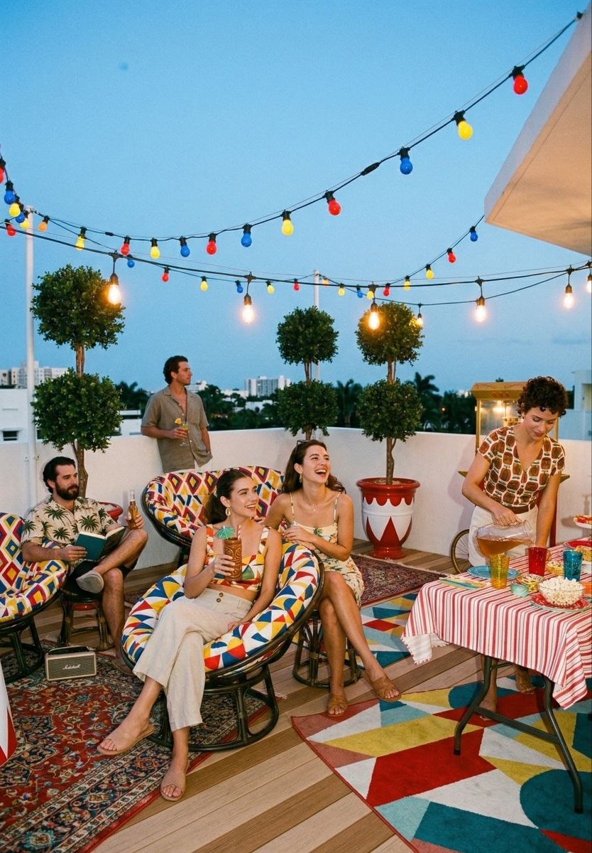Представь идеальный вечер на террасе: закатное небо, смех близких друзей и калейдоскоп ярких ковров, освещенных гирляндой цветных лампочек