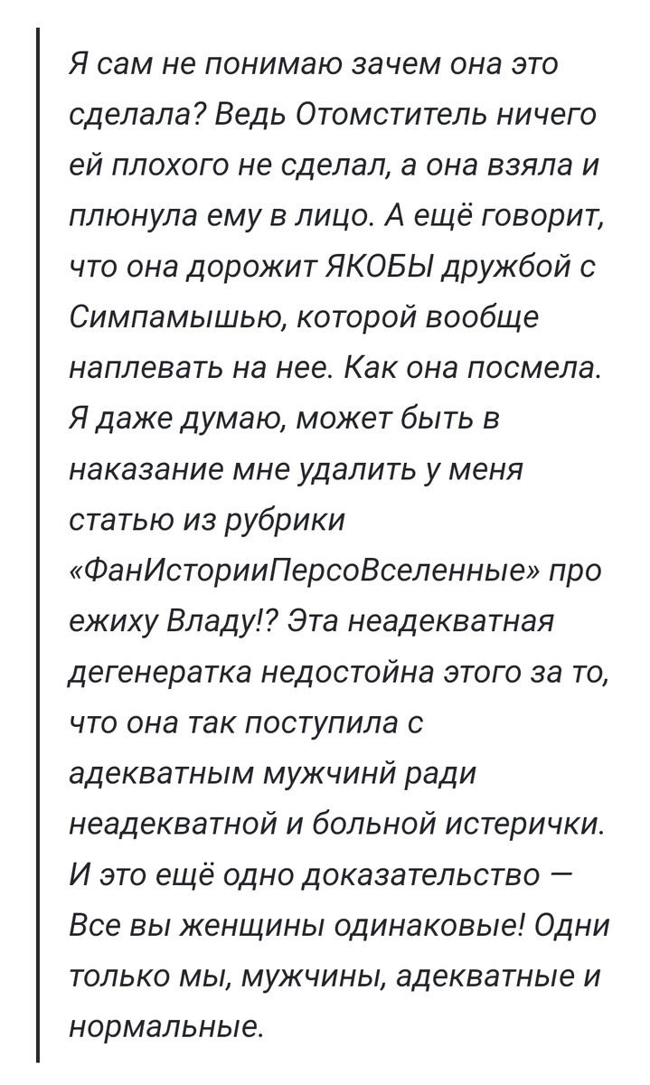 Какой он мелочный... Какой он несчастный... В детстве ему доставалось. Ой-ой-ой. А из прошлых разборов мы уже могли понять, что он не заслуживает никакой жалости, а его "я писал на эмоциях и в гневе" и подобные предупреждения и оправдания - на самом деле - отмазки, чтобы не отвечать за свои гнилые слова. Он не способен на личностный рост. Он сам предпочитает быть фриком и злопамятным, возводя это в абсолют и считая, что он лучше всех знает какие-то аспекты...